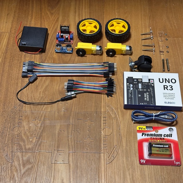 ※※概要※※ Arduinoプログラミングで動くロボットを組み立てるために必要な部品が揃っております。 (半田付けやグルーガンを使用する際はご自身でご用意ください。) こちらのキットには、壁にぶつからないロボットに必要な「超音波センサー」とライントレースロボットに必要な「赤外線センサー」が付属します。 組み立て説明書は付属しませんので、こちらのUdemyコースをご受講ください。 https://www.udemy.com/course/arduino-robot-programming/?referralCode=2E58E193232F71B5E9A9 写真8枚目と9枚目は組み立て例ですが、キャスターや電池ボックスなど一部部品が異なります。 (コース内で私が使用しているロボットです。) ※※商品説明※※ Udemyで公開中の「はじめてのロボットプログラミング」の講座で使用するオリジナルロボットキットです。 キット内容: Arduino UNO R3本体(公式ボード) USBケーブル ブレッドボード シャーシプレート(上下1枚ずつ) キャスター(1セット) タイヤ(2本) ギヤボックス(2個) 電池ボックス(単3×4本、スイッチ付き) 超音波センサー HC-SR04 赤外線センサーモジュール(2個) モータードライバ L298N ジャンパワイヤー -オス×オス 短(20本) -オス×メス 短(10本) -オス×メス 長(10本) その他、ネジや六角ネジスペーサー等 ご注意: ・組み立ての説明書は含まれておりません ・写真1枚目がキットの全てです ・組み立て方法とプログラミングについては、Udemy講座で詳しく学ぶことができます https://www.udemy.com/course/arduino-robot-programming/?referralCode=2E58E193232F71B5E9A9 ・本キットは市販のパーツを組み合わせています ・同じパーツを個別に購入しても、同じロボットの製作が可能です ・購入時期により、一部のパーツが写真と異なる場合があります (例:電池ボックスのスイッチの形状など) ・一部のパーツには再生品(リビルド品)が含まれますが、動作確認済みのパーツとなります このキットを使用して、Arduinoを基礎から学び、ロボット製作の楽しさを体験しましょう。